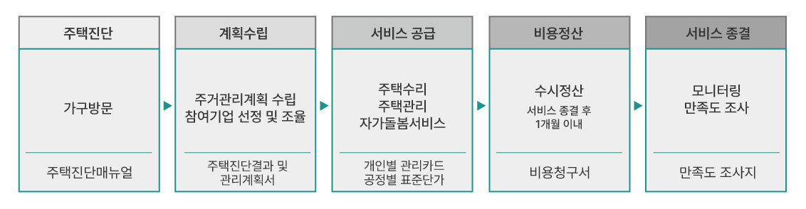 • 접수 (통합창구) 후 홈케어매니져의 가구방문을 통한 주택진단, 계획수립과정 이후 서비스공급 진행 └ 상담, 현장진단을 통해 서비스비용, 재료비 등 산정 후 서비스 계약, 서비스진행